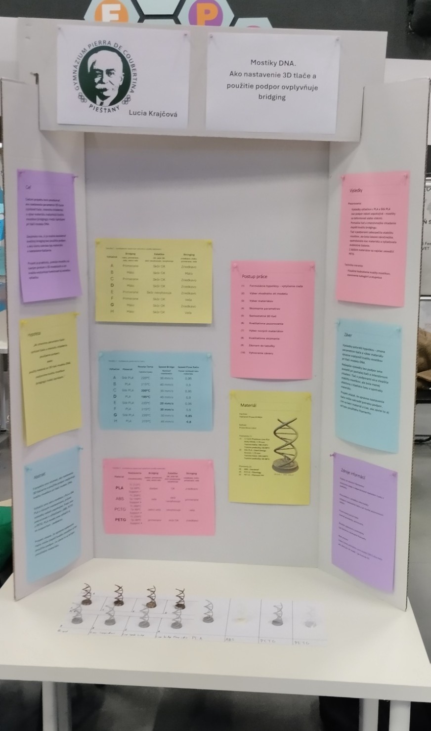 – projekt analyzoval, ako nastavenie parametrov tlače, výber materiálu a použitie podpôr pri tlači modelu špirály DNA ovplyvňuje kvalitu bridgingu. (Lucia Krajčová)