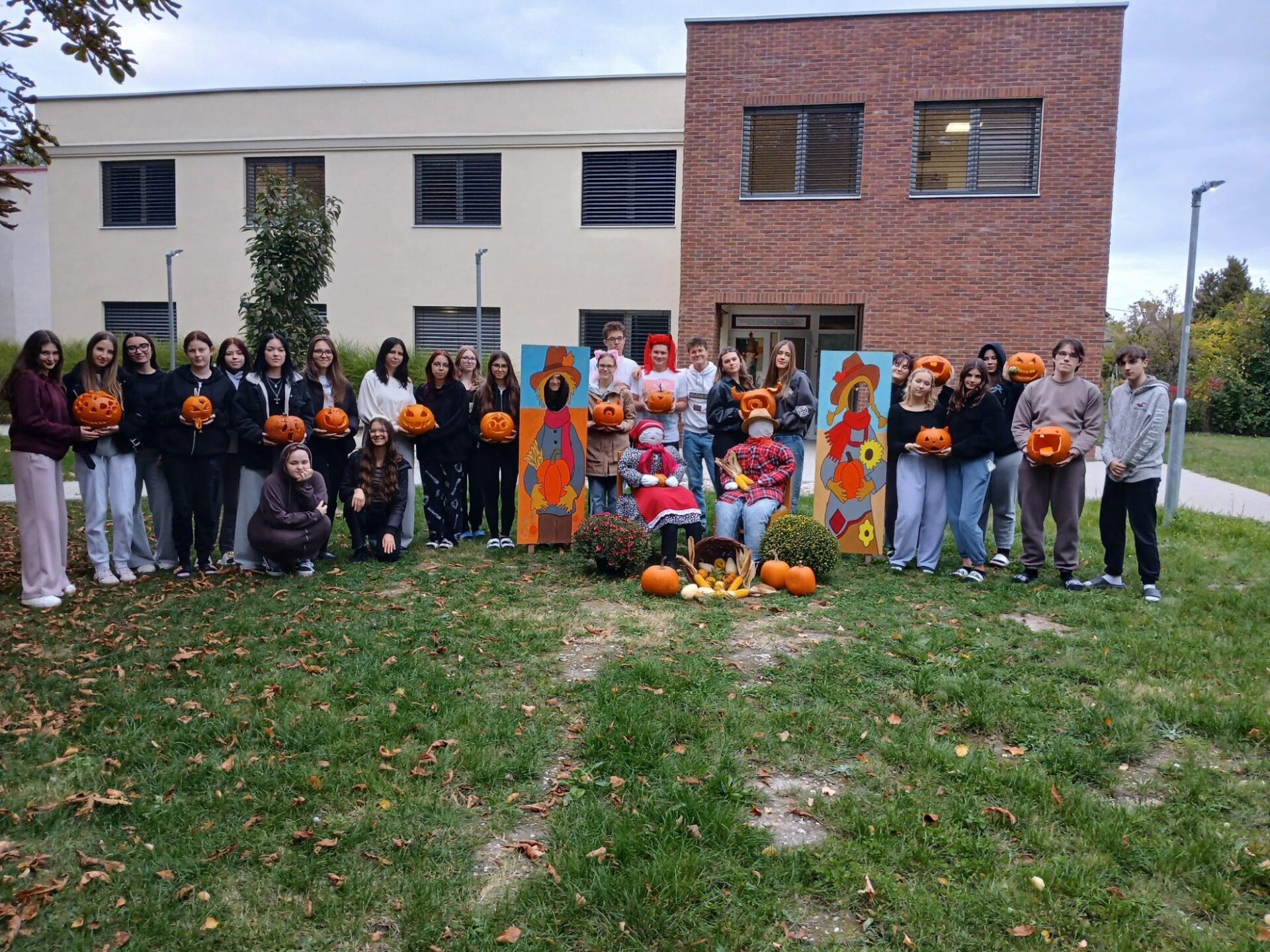 Prišla jeseň a s ňou aj náš Študentský domov pri Obchodnej akadémií vo Veľkom Mederi obliekol nový šat – teplý, farebný a veselý jesenný kabát. Už na dvore cítiť, že sa deje niečo výnimočné: vchod a dvor zdobia usmiate tekvice, ktoré spoločne vyrezávali študenti. Každá je iná – niektorá vtipná, iná strašidelná, ale v každej sa skrýva kúsok študentskej lásky a kreativity.