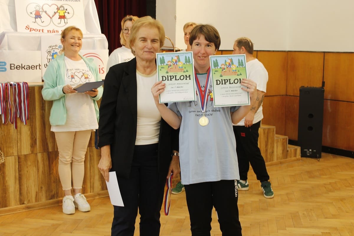 O úsmev na tvári a dobrú náladu sa postarali maskoti Mickey Mouse a Minnie. Ďalej sme medzi hosťami privítali poslancov TTSK, zástupcov Odboru sociálnych vecí TTSK a starostu obce Pastuchov. Čo sa týka umiestnenia jednotlivých družstiev, 3. miesto obsadilo CSS Jahodná, 2. miesto DSS Pastuchov a víťazmi sa stali súťažiaci z CSS Šoporňa – Štrkovec. Verím, že si všetci zúčastnení odniesli aj mnoho zážitkov zo spoločne stráveného dňa. Na záver už len veľká vďaka patrí všetkým zamestnancom DSS Pastuchov, ktorí sa spolupodieľali na organizácii nášho športového podujatia.