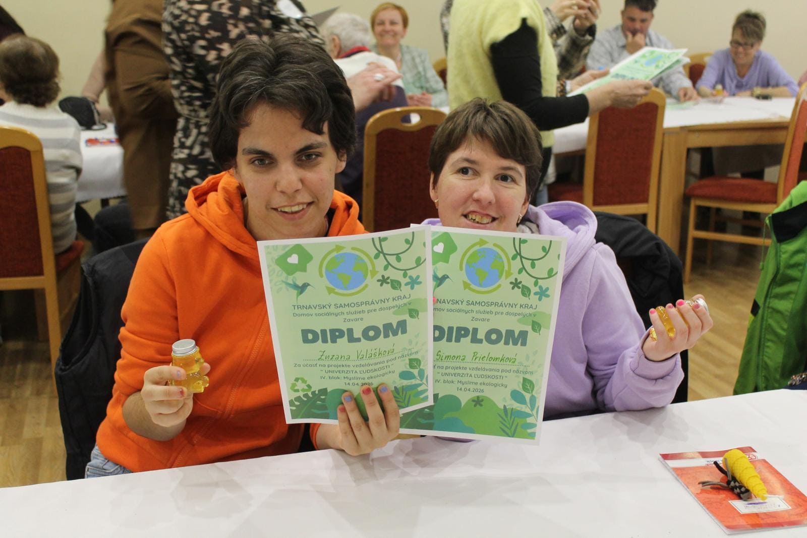 Naše dve prijímateľky sociálnej služby Simonka a Zuzka, sa 14. 4. 2026 zúčastnili v Zavare vzdelávacieho projektu pod názvom: „Univerzita ľudskosti“. Tento ročník univerzity sa niesol pod názvom „Myslíme ekologicky“. Dozvedeli sa veľa zaujímavostí o tom, ako správne recyklovať PET fľaše, pod mikroskopom sa zoznámili so životom včiel, ochutnávali ich med a na pamiatku si vyrobili sviečku z včelieho plastu. Z deravého trička si urobili perfektné kľúčenky. Tento príjemný deň všetkým zúčastneným spestril žabiak Emil so zábavným kvízom. Za pozvanie patrí srdečná vďaka všetkým organizátorom tohto vzdelávacieho projektu.