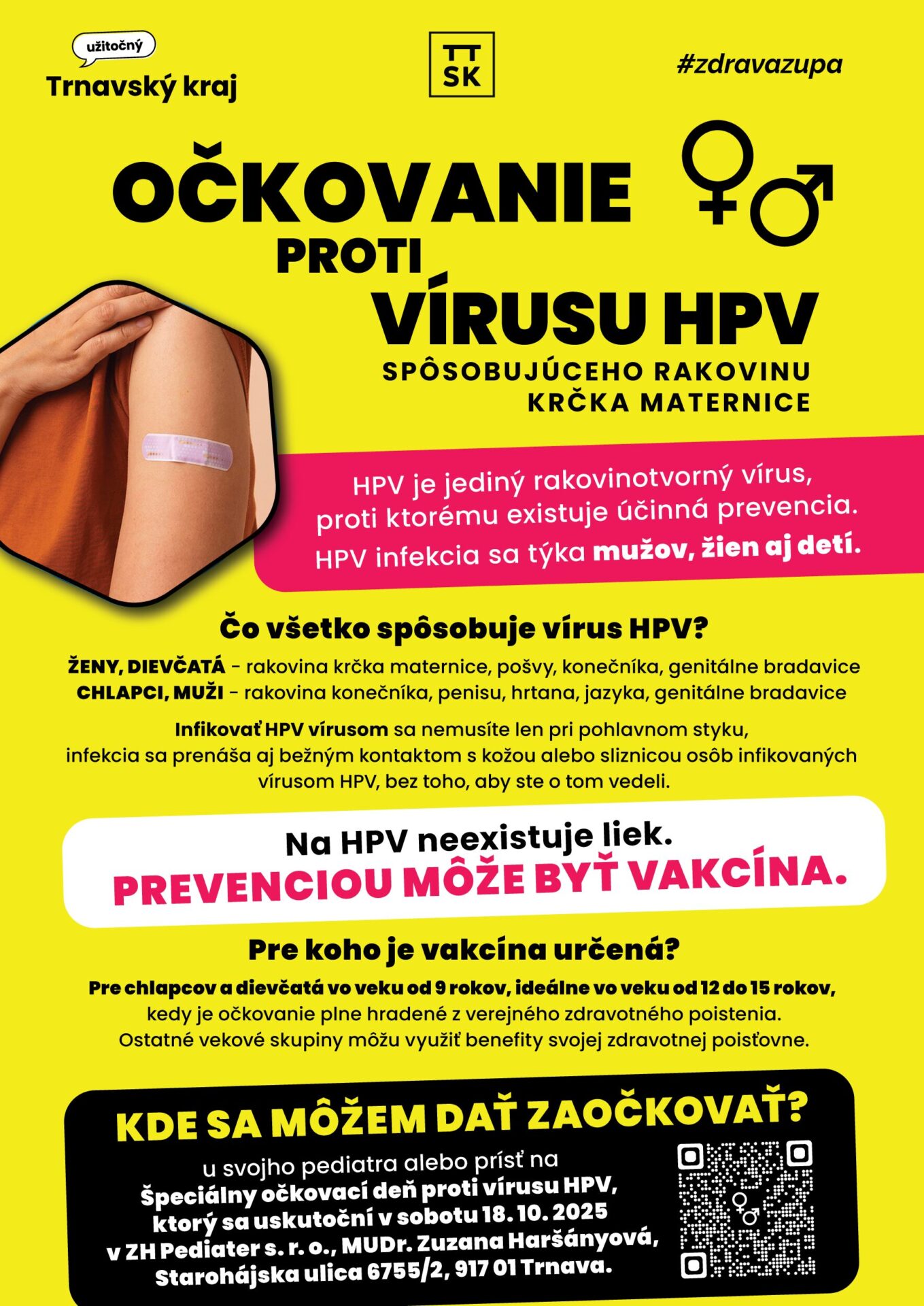 Trnavský kraj aj v tomto roku pokračuje v prevencii pred rakovinotvorným HPV. Ľudský papilomavírus je vysoko nákazlivý. Prenáša sa najmä pohlavným stykom a počas života sa s ním stretne väčšina sexuálne aktívnych ľudí. Najúčinnejšou ochranou pre všetkých je očkovanie, ktoré výrazne znižuje riziko vzniku viacerých druhov rakoviny.